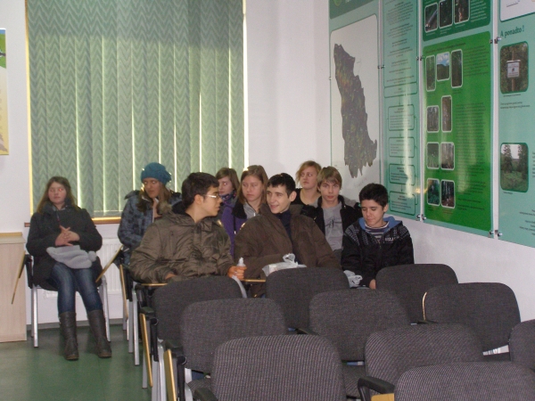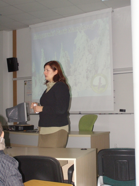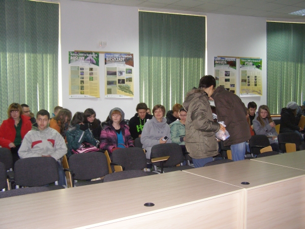 Podczas wykładu na sali konferencyjnej Pani Katarzyna Gładysz, pracująca w ośrodku edukacyjnym Magurskiego Parku Narodowego mówiła młodzieży o tym, czym jest park, jakie są jego cele, które realizowane są w oparciu o Ustawę Ministerstwa Środowiska, w jaki sposóbtworzony jest plan ochrony i na czym należy się skupić i co trzeba zrobić aby dbać o park. Pani Gładysz przedstawiła młodzieży schemat organizacyjny Magurskiego Parku Narodowego czyli jakie osoby pracują w poszczególnych działach (np.Dyr ds. ochrony przyrody, Nadleśniczy, Leśniczowie, Podleśniczowie, Straż parku), w kontekście tym zaznaczyła jakie wykształcenie należy mieć, by pracować w MPN. Ciekawym punktem wykładu był temat dotyczący monitoringu zwierząt oraz jej śmiertelności jej drodze wojewódzkiej 992. Pani Katarzyna mówiła o technice pomocnej w monitoringu (foto-pułapki, scenki filmowe z naturalnych zachowań), które są bardzo pomocne i umożliwiają leśniczym nocną obserwację przyrodniczą z dużych odległości, bez ingerencji w życie zwierząt, jak również wykorzystywanie ich do tropieni kłusowników.