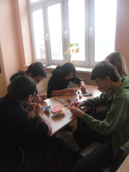 W grudniu na zajęciach klubu uczestnicy zajęć poznawali tajniki rozwiniętej w Japonii sztuki składania papieru - orgiami. Poprzez odpowiednie składanie kartki papieru można otrzymać naprawdę ciekawe figury przestrzenne. Jak na razie stawiamy pierwsze kroki i wykonaliśmy kwiaty, ale to dopiero początek.